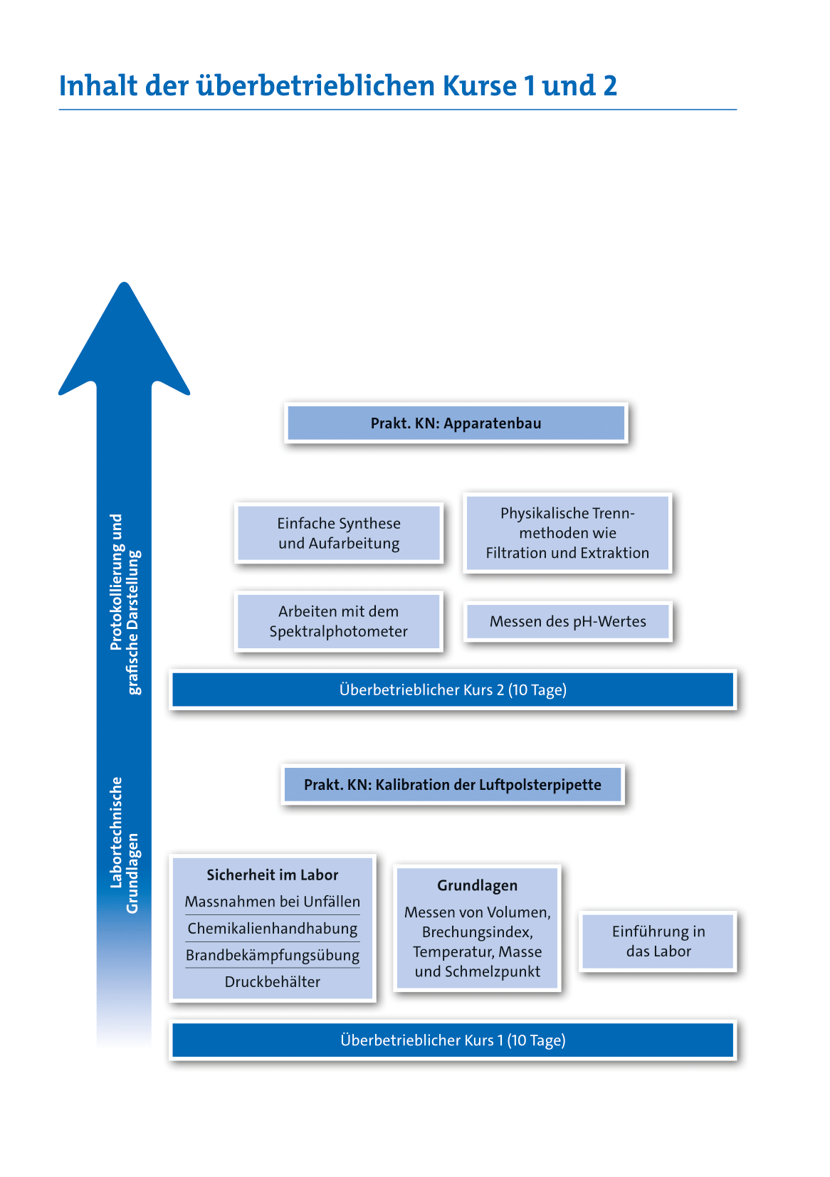 Der überbetriebliche Kurs 1 und 2 wird zu Beginn der Berufsbildung durchgeführt und beschäftigt sich mit den Hauptthemen Sicherheit, Verhalten im Labor sowie dem Umgang mit den gängigen Hilfsmittel, Geräten und Gefahrstoffen.
