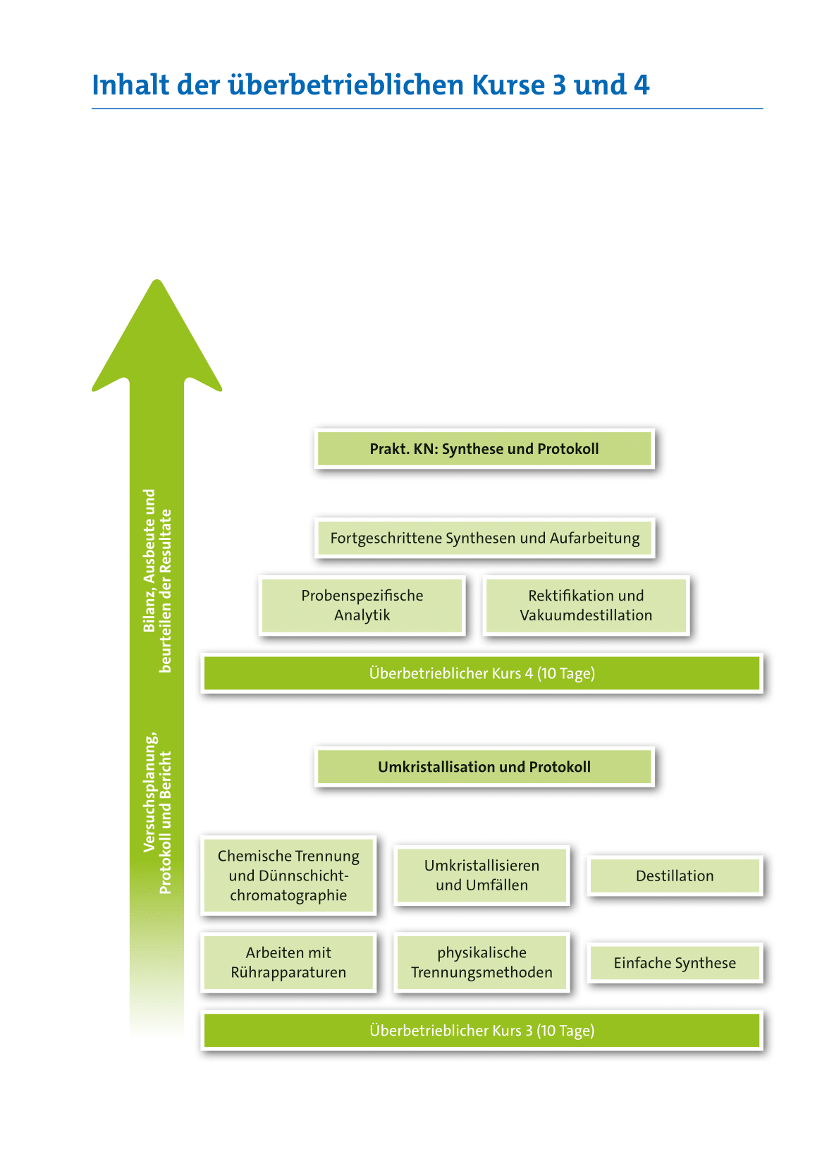 Der überbetriebliche Kurs 3 und 4 wird im Laufe des 4. Semesters durchgeführt und beschäftigt sich mit dem Transfer der Grundtechniken sowie der Techniken aus den Fachbereichen mit dem besonderen Schwerpunkt des Synthetisierens von chemischen Verbindungen, dem damit verbundenen Apparatebaus, der Reinigungsprozesse und Identifizierung der chemischen Verbindungen.